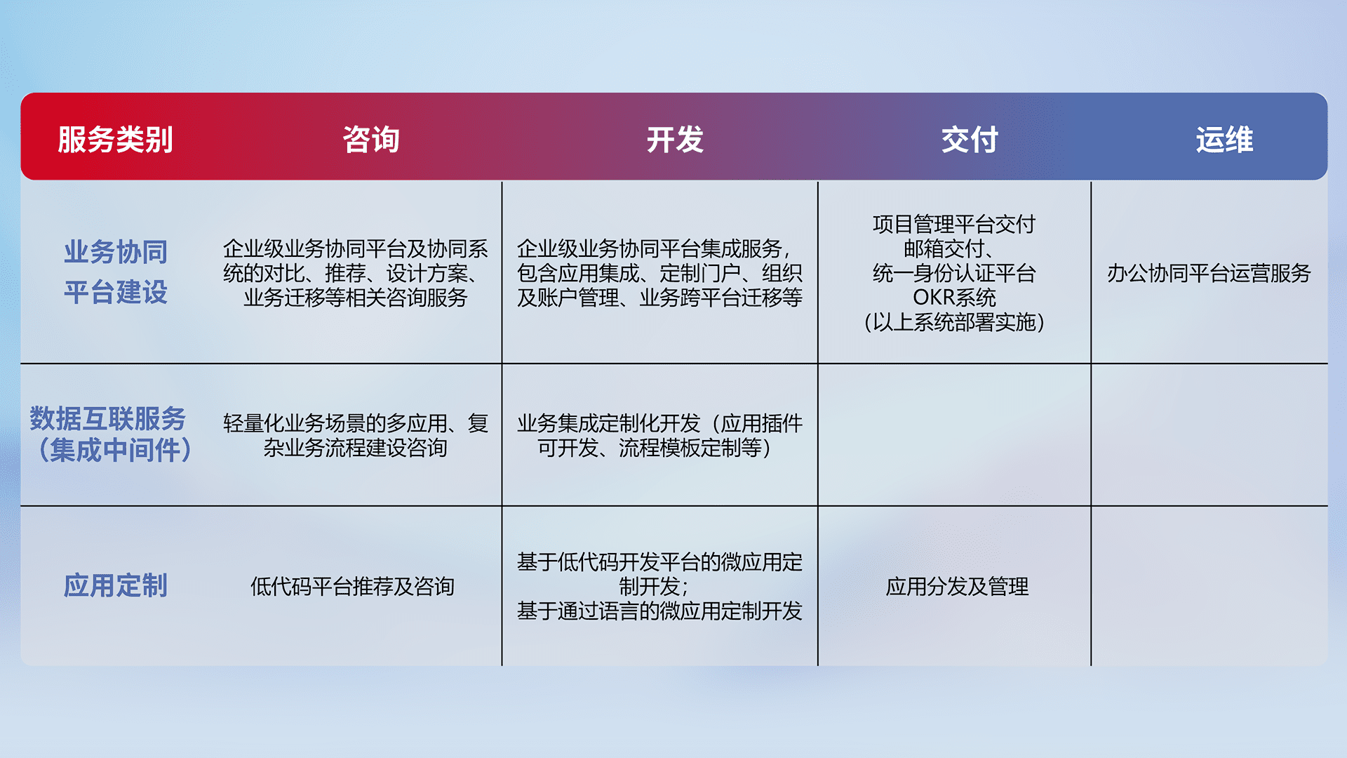 针对钉钉、、、、企微、、IDaas等平台级产品提供产品的规划、、、方案、、、交付、、、定制化开发等服务,,实现如统一协同办公、、智能客户服务、、、混合会议管理、、、智能数据查询、、等业务场景,,,实现数字化转型。。。